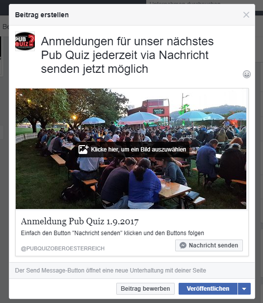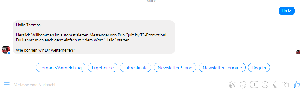 Ebenso eignen sich Chatbots zum Aussenden von Newslettern, Produktneuheiten oder um das wöchentliche Mittagsmenü auszusenden. Der User bekommt es direkt in den Messenger zugestellt und liest es sicher aufmerksamer, als dies im News Feed der Fall ist. Perfekt eignet es sich auch für Veranstaltungen. Die User müssen sich via Messenger anmelden, sämtliche updates kann man allen Angemeldeten nun mit einem Klick zusenden (Programm, neuer Termin, Verschiebungen, Absagen). Wie so etwas aussehen kann, kannst Du Dir gerne auf einer unserer Facebook-Seiten ansehen (www.facebook.com/pubquizoberoesterreich).