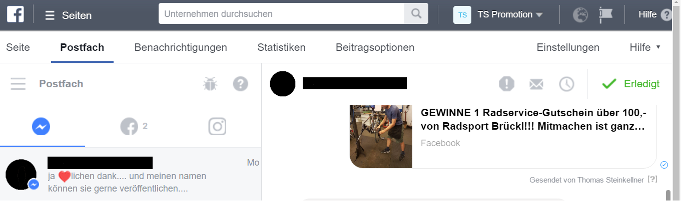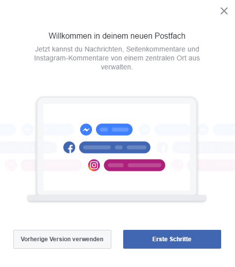 Klickt man in der Postfach auf das Fragezeichen kann man auch wieder zur „alten Version“ mit den Nachrichten zurückwechseln. Allerdings hilft uns das neue Postfach alle Messenger-, Facebook- und Instagrambenachrichtigungen von einem Ort aus zu verwalten: