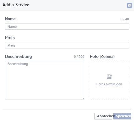 Hier einfach den Namen der Dienstleistung, den Preis und die Beschreibung der Dienstleistung (max. 200 Zeichen) einfügen, dann noch ein Foto hinzufügen, schon sehen Deine Fans Deine Dienstleistung am Anfang Deiner Facebook-Page
