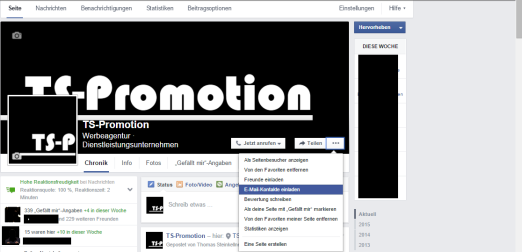 Zunächst müssen wir im Infobereich nachsehen, ob unser Unternehmen als lokales Unternehmen eingestellt ist (sonst funktioniert diese Aktion nicht). Danach auf den Button mit den 3 Punkten im Titelbild der Facebook-Page und auf E-mail Kontakte einladen klicken.