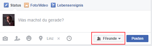 Hier kannst Du einstellen wer Dich markieren kann und wie Dein Account nach außen hin erscheint. Wer Deine zukünftigen Inhalte sehen kann sollten hier eingestellt werden. Wir empfehlen als Standardeinstellung Freunde. Allerdings kann man dies bei jedem einzelnen Posting auch manuell einstellen. Hierfür einfach beim Posting selbst auf folgendes Feld klicken: