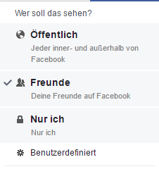 Als Voreinstellung sollte hier Freunde ausgewählt werden (es geht ja sonst niemanden etwas an was ich mache). Bin ich allerdings Seitenadministrator und möchte das Posting von meinem privaten Account aus auf meiner Firmenseite teilen muss ich die Option öffentlich wählen, andererseits kann ich es nicht auf meiner Facebook-Seite teilen. Bei der Option Benutzerdefiniert kann ich auswählen wer es sehen soll, kann Gruppen auswählen die ich selbst voreingestellt habe oder kann auch bestimmte Personen ausschließen.